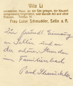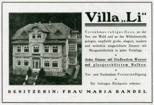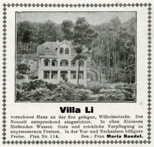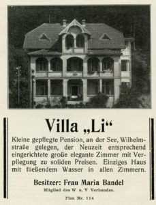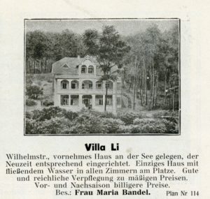 Frau Schmuckler hieß mit Vornamen „Luise“. Aus ihrem Vornamen wurde dann der Name der Villa mit „Li“ gebildet. Frau Schmuckler betrieb ihre Villa Li bis 1924 als Pension.
